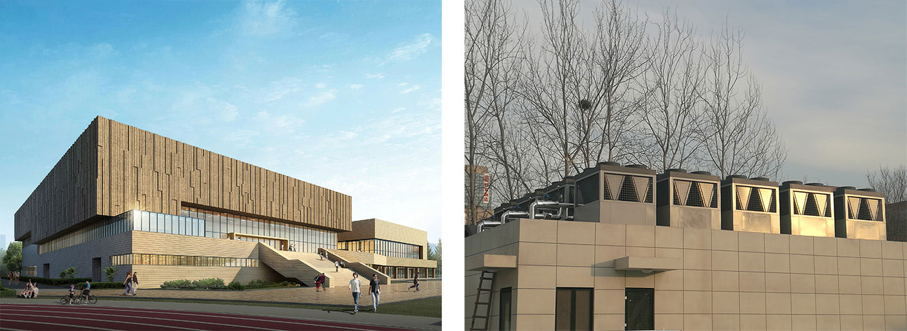 齐鲁工业大学艺体中心通风空调项目总建筑面积约30000平方米,由会堂、篮球馆、排球馆、羽毛球馆等多个高大空间体育场馆组成。为了解决高大空间送风困难、风量不均匀等问题,同时达到羽毛球、乒乓球等竞技类场馆对风速的严格要求,系统采用风冷热泵机组+组合式空调机组+风机盘管实现夏季制冷供暖,蒸汽换热机组+组合式空调机组+风机盘管实现冬季供暖功能。整体系统利用率高,用户体验感舒适性强,节能环保效益明显。